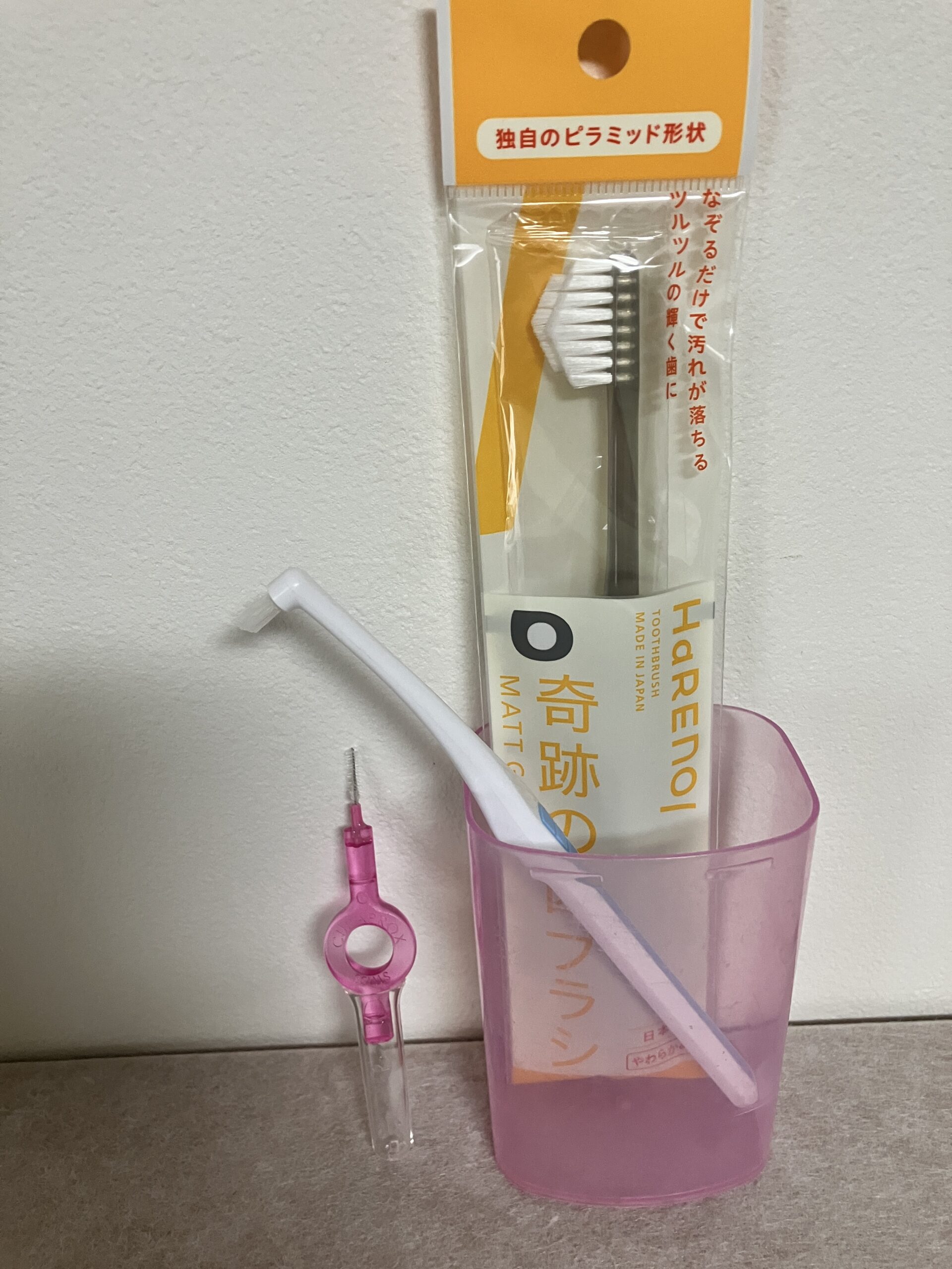 ここからは、写真に写っている“インビザライン生活で愛用中のケアグッズ”を左から順番に紹介します。