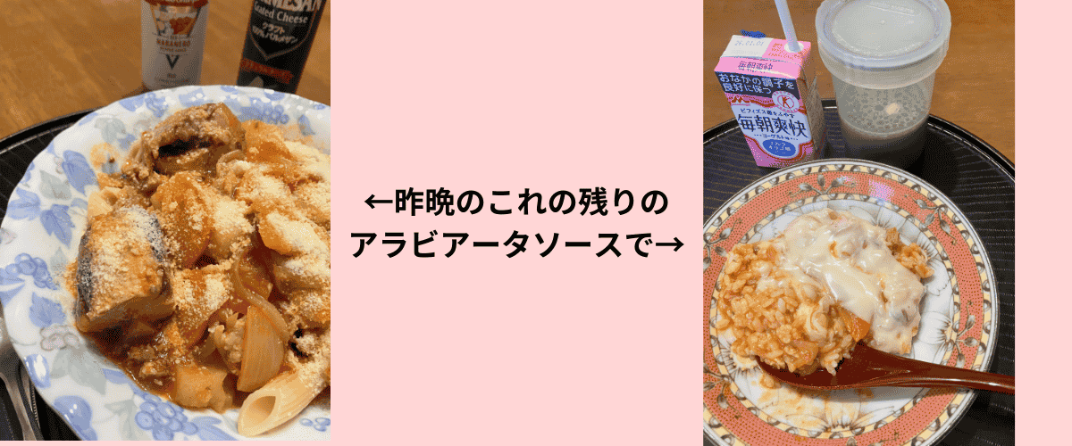 ③ 前日の夕飯の残りのアラビアータソースにご飯&オートミールを入れ、チーズをのせてリゾットに。これがめっちゃ美味しかった^^