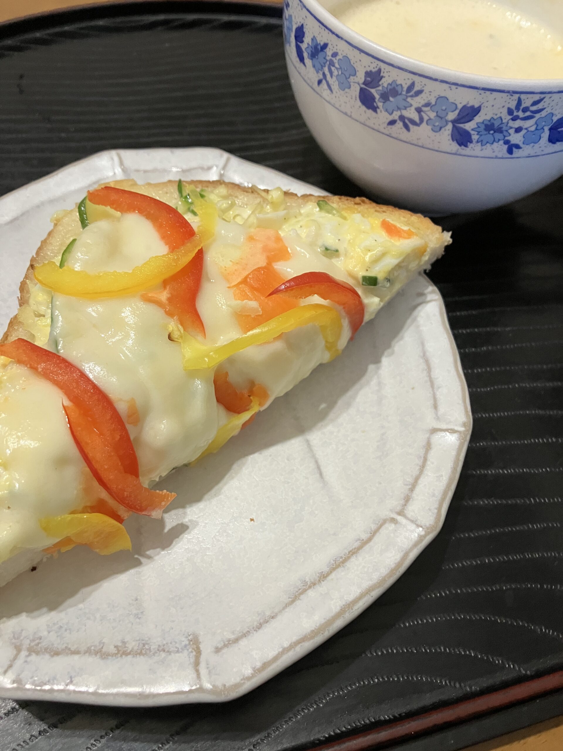 (昨日の残りのポテトサラダ+千切りキャベツを混ぜて、チーズをのせて、仕上げにパプリカぱらぱら)